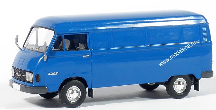 Модель. Микроавтобус «Mercedes-Benz L 206 D Kasten», масштаб "НО" (1:87). Производство «Brekina», Германия. Серия «Starmada». Номер по фирменному каталогу 13300. Фотография выполнена с реальной модели.